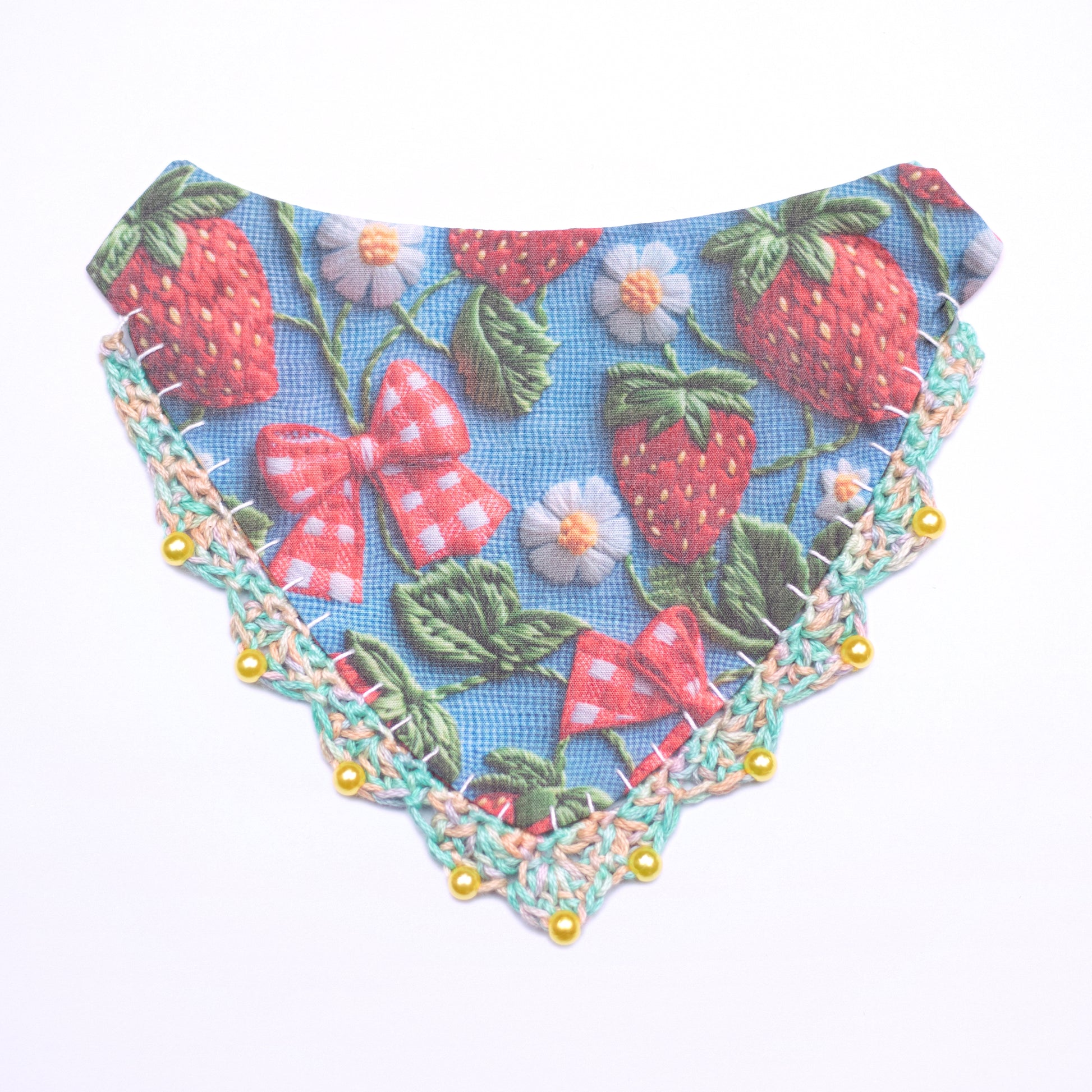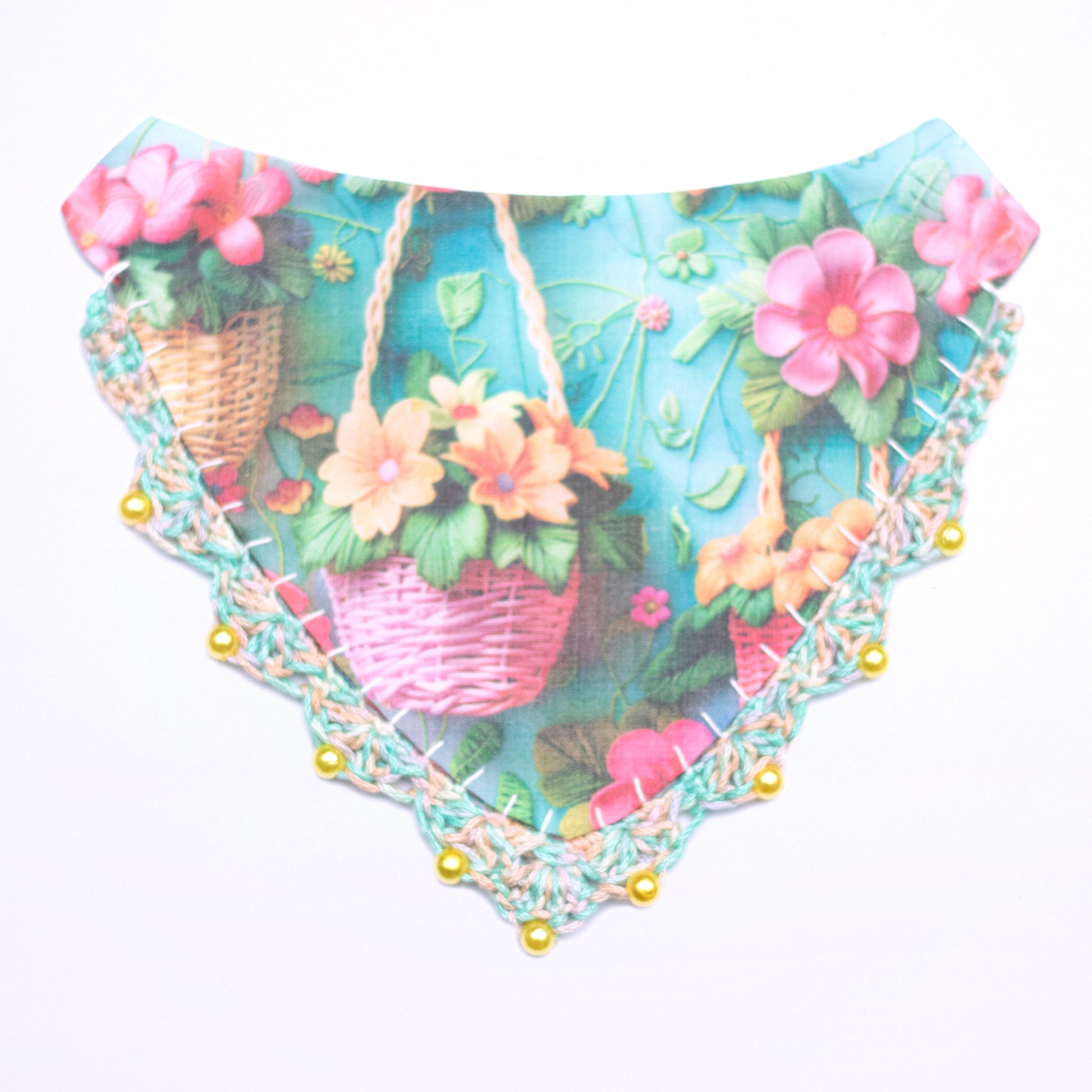 This reversable bandana comes with a buttoned crochet collar or crochet strings.